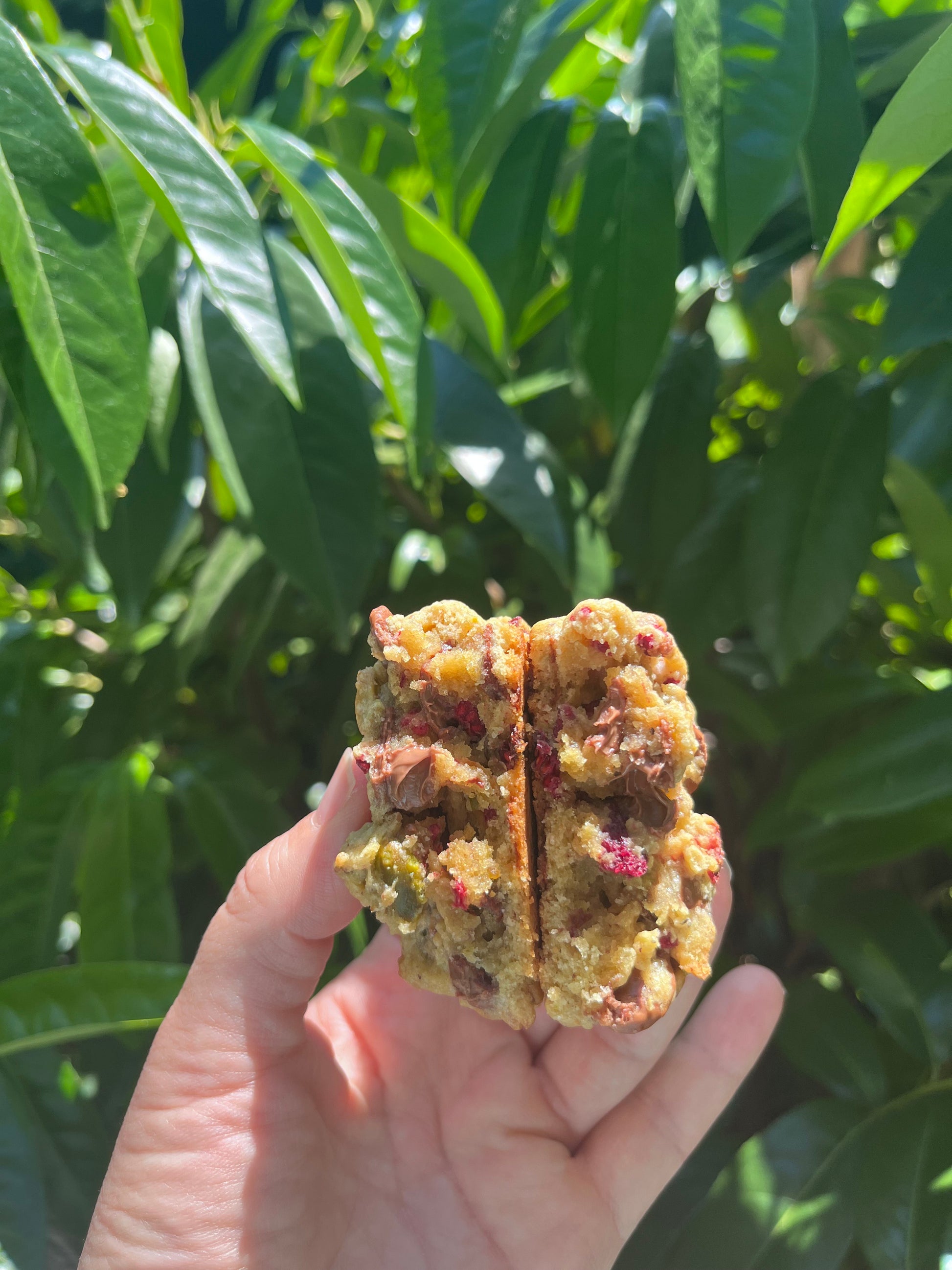 Cookie artisanal – Chocolat au lait, Pistaches entières et framboises – Réduit en sucre